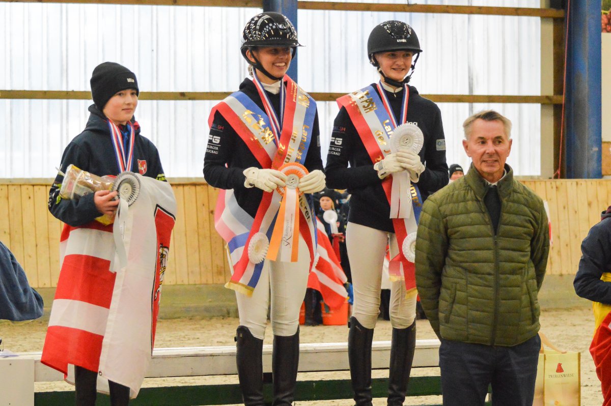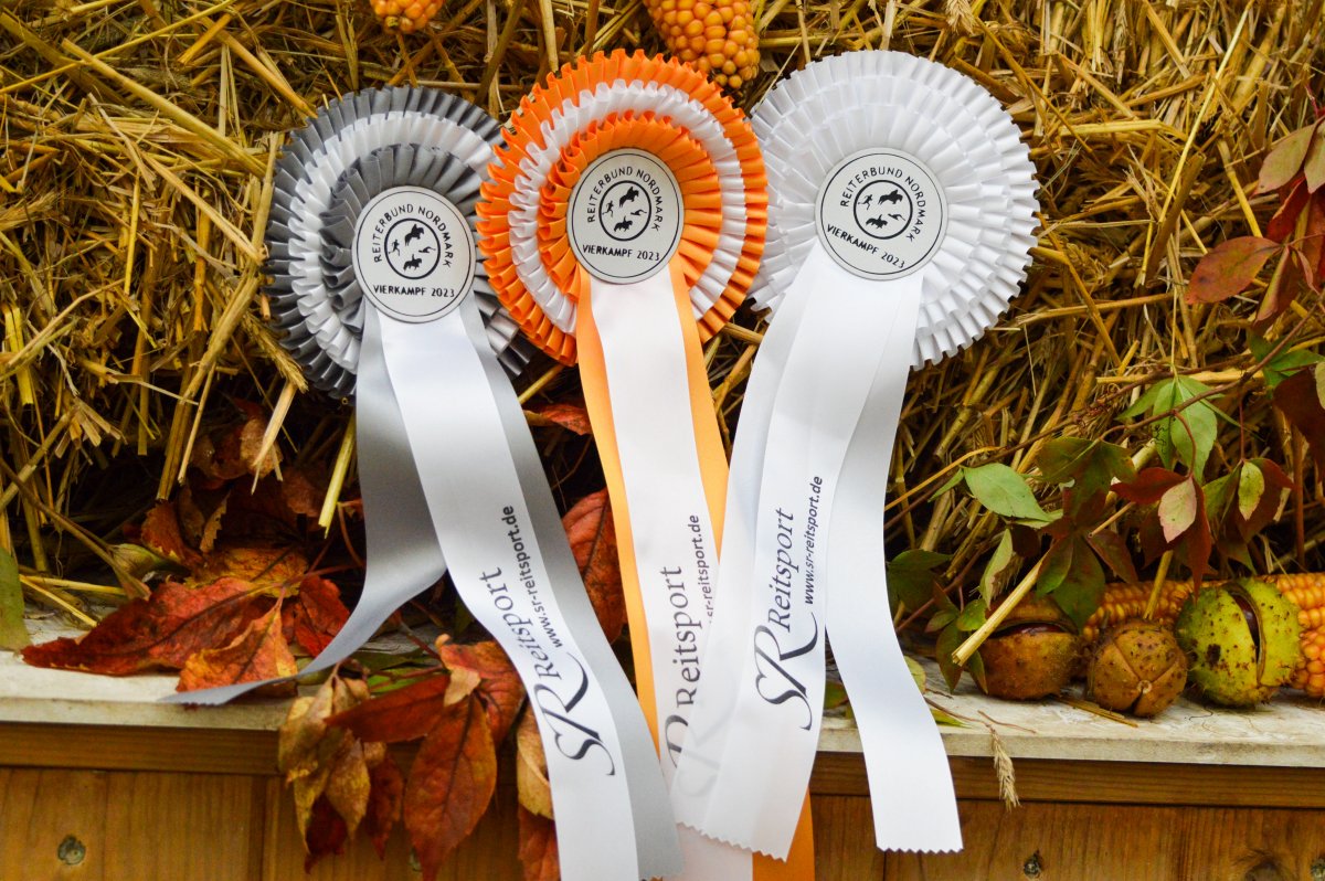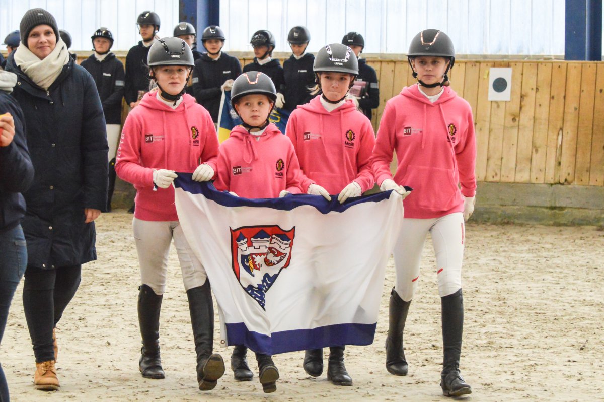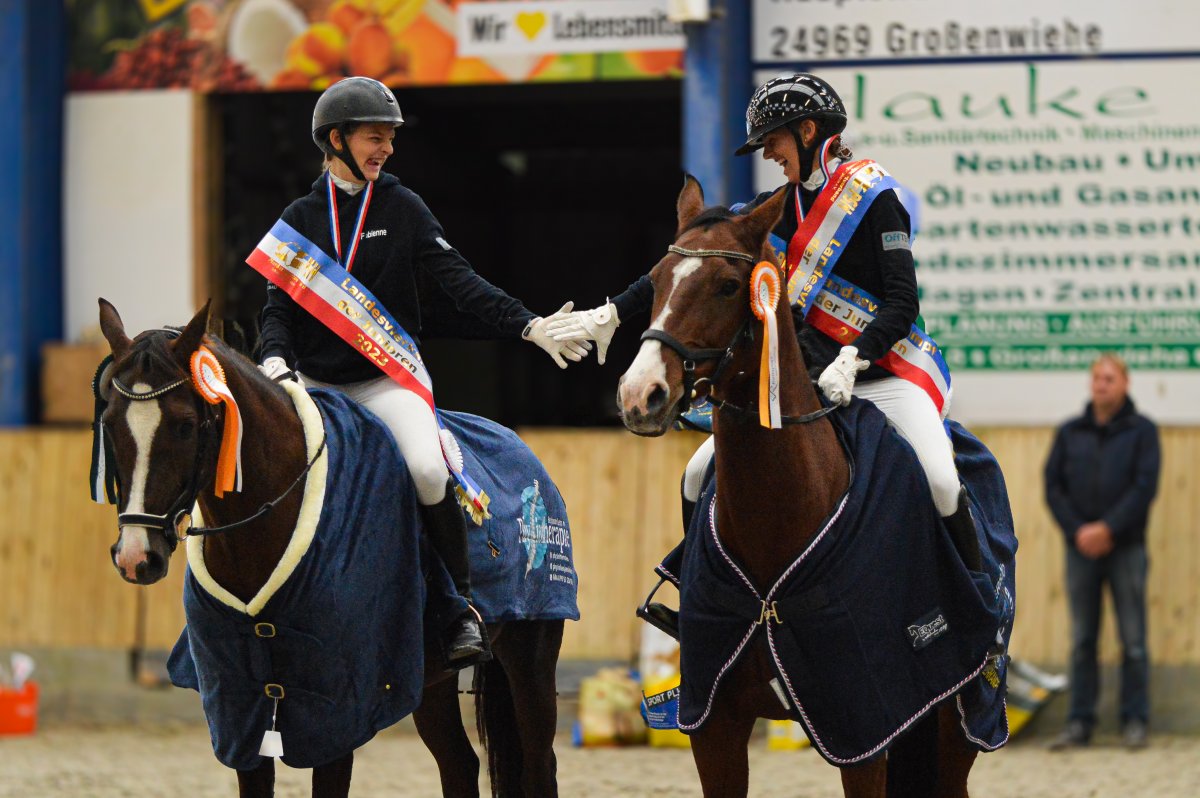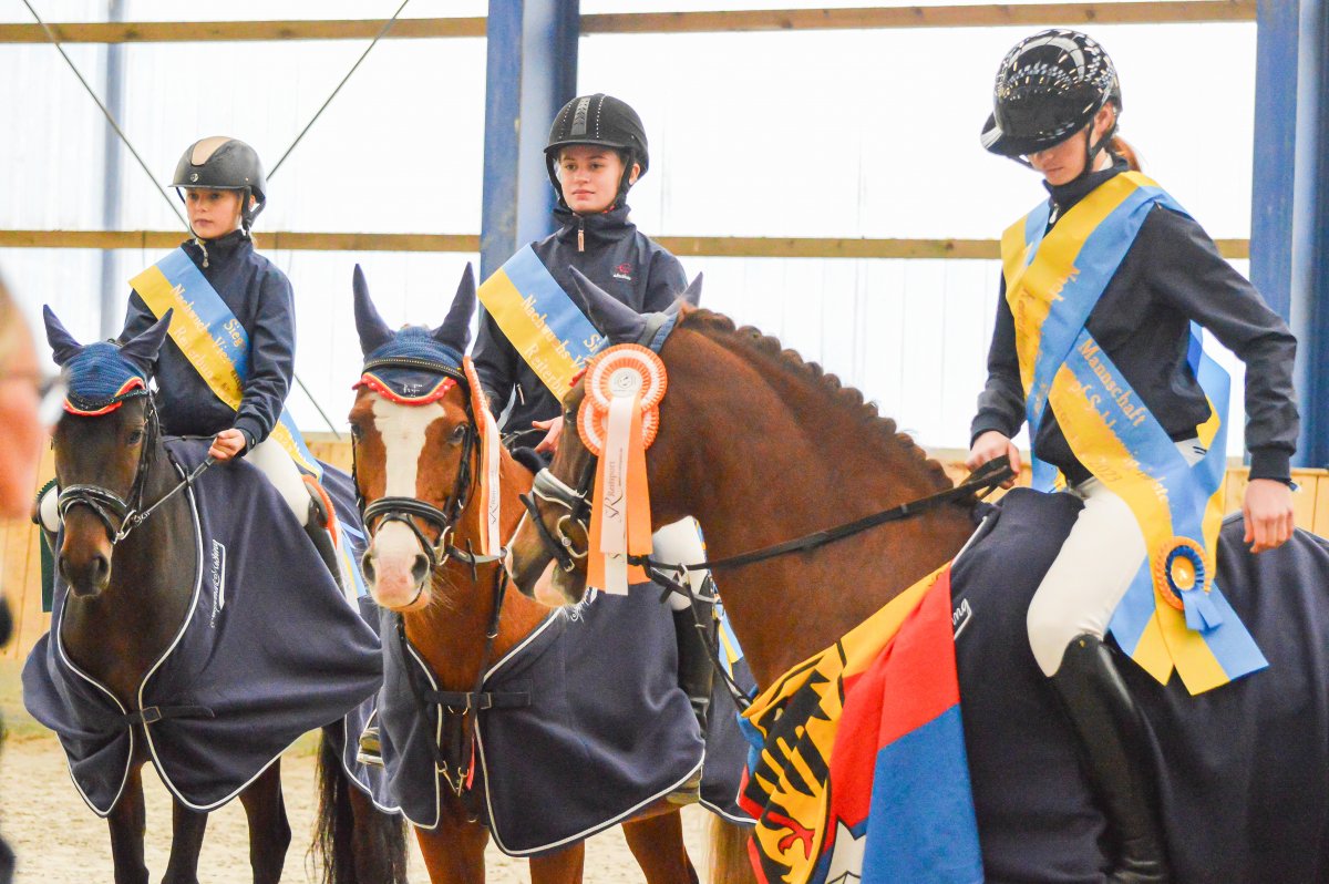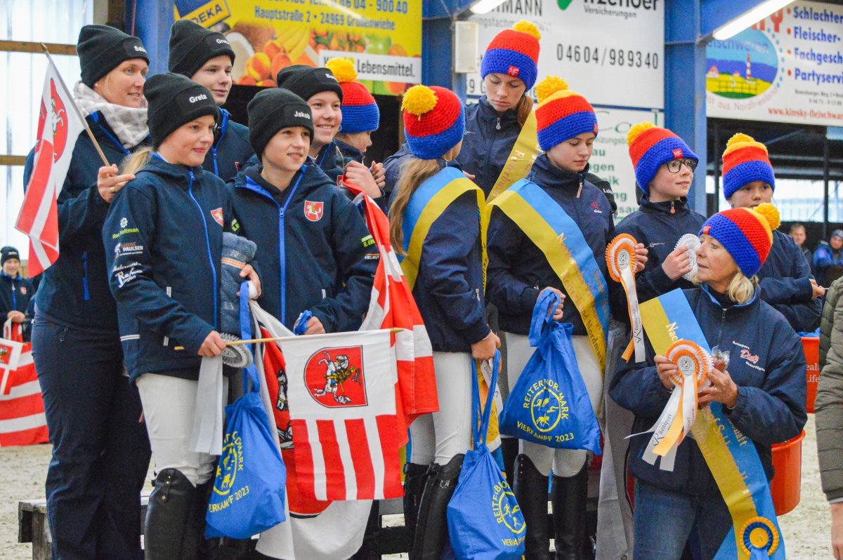 Ein ereignisreiches Wochenende liegt hinter den Teilnehmern des Landesvierkampfes 2023, der in diesem Jahr im Kreis Schlewig-Flensburg ausgetragen wurde. Rund 50 Nachwuchsreiter gingen für ihre Reiterbünde in den Disziplinen Schwimmen, Laufen, Springen – sowohl in der Einzel- als auch in der Mannschaftswertung – an den Start. Am Samstag Nachmittag startete der Wettkampf mit dem Crosslauf. Während die Junioren der "Großen Tour“ einen 3000 Meter Lauf absolvieren mussten, begrenzte sich die Strecke für die Reiter in der Nachwuchstour auf 2000 Meter. Direkt im Anschluss ging es weiter in die Schwimmhalle, wo die jungen Sportler erneut ihr Können im Schwimmbecken unter Beweis stellen mussten. Abgerundet wurde der Samstagabend mit einem geselligen Beisammensein in der Jugendherberge, wonach Kräfte für den nächsten Tag gesammelt wurden. Am Sonntag standen als erstes die Dressurprüfungen mit Pferdewechsel auf dem Programm. Bereits herbstlich geschmückt war die Vereinshalle in Großenwiehe, die mit besten Bedingungen für die Teilnehmer als Veranstaltungsort für den diesjährigen Vierkampf vorgesehen war. Für die Junioren galt es, zunächst mit dem eigenen Pferd eine Dressurprüfung der Klasse A* zu absolvieren, um dann im Anschluss noch ein fremdes Pferd vorzustellen. Auch die Nachwuchsreiter gingen in der Dressur der Klasse E an den Start, allerdings in einer Mannschaftsdressur ohne Pferdewechsel. Nach den Dressuren ging es im Parcours weiter. Für die Junioren wurde ein Stilspringen der Klasse A mit zwei Sternen aufgebaut, welches für das ein oder andere Paar einige Klippen bereithielt – schließlich war es für viele Pferde das erste Hallenturnier. Somit war der Jubel des Publikums auf den vollbesetzten Rängen groß, sobald die Teilnehmer des eigenen Reiterbundes fehlerfrei blieben. Auch die Nachwuchsreiter in der "Kleinen Tour“ durften sich im Parcours messen – hier in einem E-Springen mit Ausgleich. Im Anschluss fanden sich alle Teilnehmer zur Siegerehrung ein. Für den Reiterbund Nordmark war es ein besonders erfolgreiches Wochenende – Nicht nur durften sie den Wettkampf ausrichten, auch siegte die Mannschaft Nordmark II, vorgestellt von Britta Mühlenbeck, mit 15553 Punkten in der diesjährigen Landesmeisterschaft der Vierkämpfer. Mit 14739 Punkten folgte der Reiterbund Dithmarschen unter der Leitung von Stella Farchim, auf Rang drei mit 14113 platzierte sich die Mix-Mannschaft bestehend aus den Reiterbünden Nordfriesland, Rendsburg-Eckernförde und Pinneberg. Clara Marie Otzen, welche ebenfalls für den Reiterbund Nordmark an den Start ging, sammelte am Sonntag nochmal reichlich Punkte und sicherte sich somit den Titel „Einzel-Landesmeisterin der Vierkämpfer“. Mia Peters aus Dithmarschen freute sich über den Vizetitel, für Ina Losigkeit aus dem gastgebenden Reiterbund gab es in der Einzelwertung die Bronzemedaille. Auch der Reiterbund Nordfriesland hatte allen Grund zum Feiern. Nach erfolgreich absolvierten Disziplinen, sicherten sich die Nachwuchsreiter den Mannschaftssieg. Platz zwei ging an den Reiterbund Dithmarschen, auf Rang drei platzierte sich die Mix-Mannschaft Dithmarschen-Nordfriesland. In der Nachwuchstour brillierte Alva Maj Nissen aus Nordfriesland, die kurzerhand die Einzelwertung für sich entschied. Dicht auf den Fersen war ihr Matha Sophie Breiter aus Rendsburg-Eckernförde, die am Ende auf Platz zwei rangierte. Paula Kampen vom Reiterbund Pinneberg ergatterte sich die Bronzemedaille. „Wir hatten ein fantastisches Wochenende mit toller Stimmung und sind sehr dankbar, dass wir den Vierkampf ausrichten durften. Bereits die Planung im Vorfeld hat durch das gut strukturierte Organisationsteam gut geklappt, sodass für eine rundum gelungene Veranstaltung auf die Beine stellen konnten. Besonders bedanken möchte ich mich an dieser Stelle auch nochmal bei unseren Sponsoren, die diese Veranstaltung so tatkräftig unterstützt haben, und an den Reit- und Fahrverein Großenwiehe für das Bereitstellen der Anlage.“, rundet Britta Mühlenbeck, Jugendwartin des Reiterbundes Nordmark, die Veranstaltung ab.