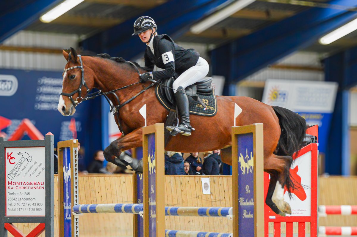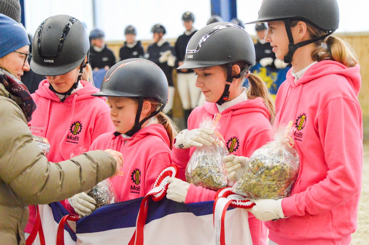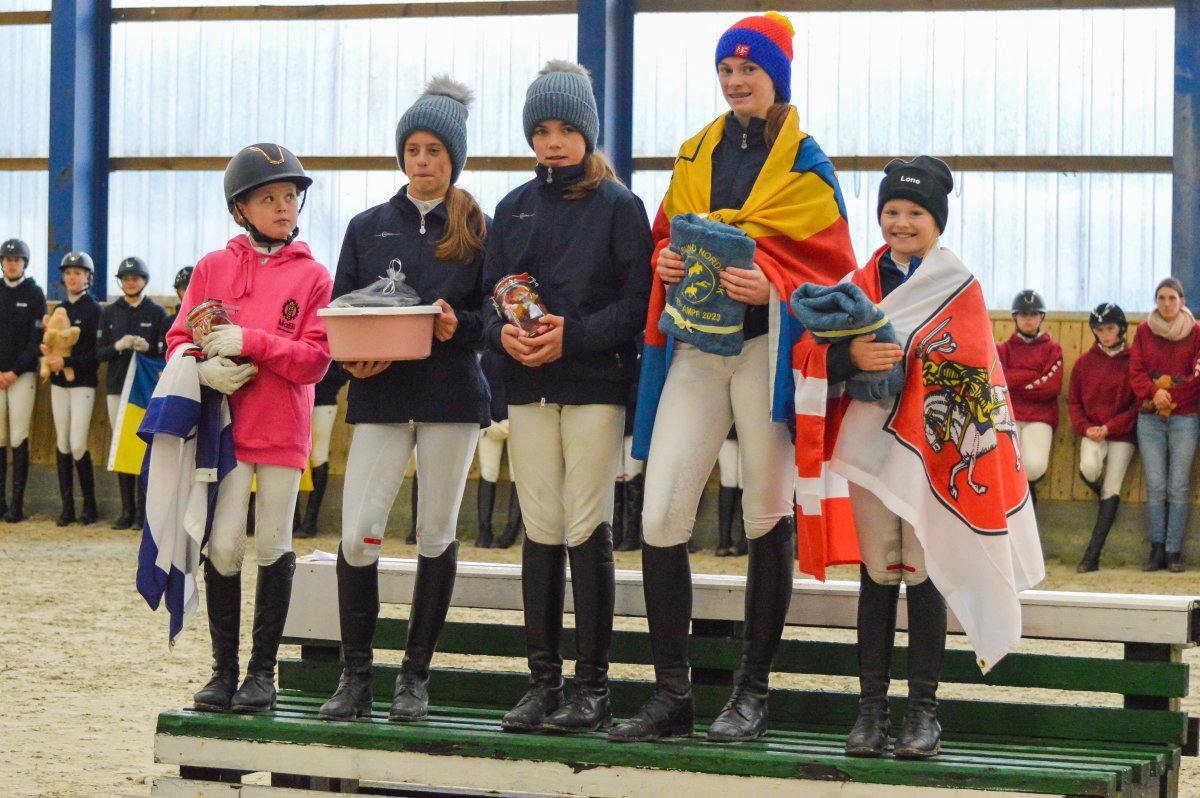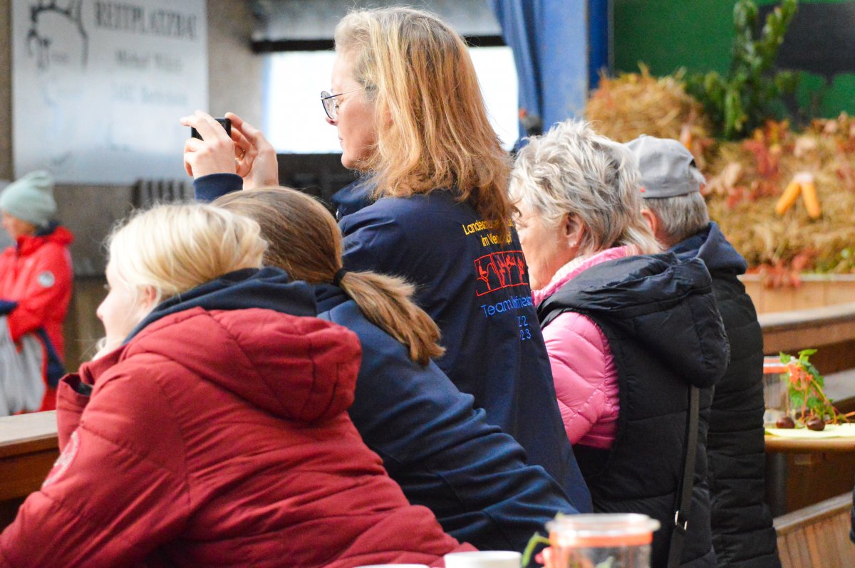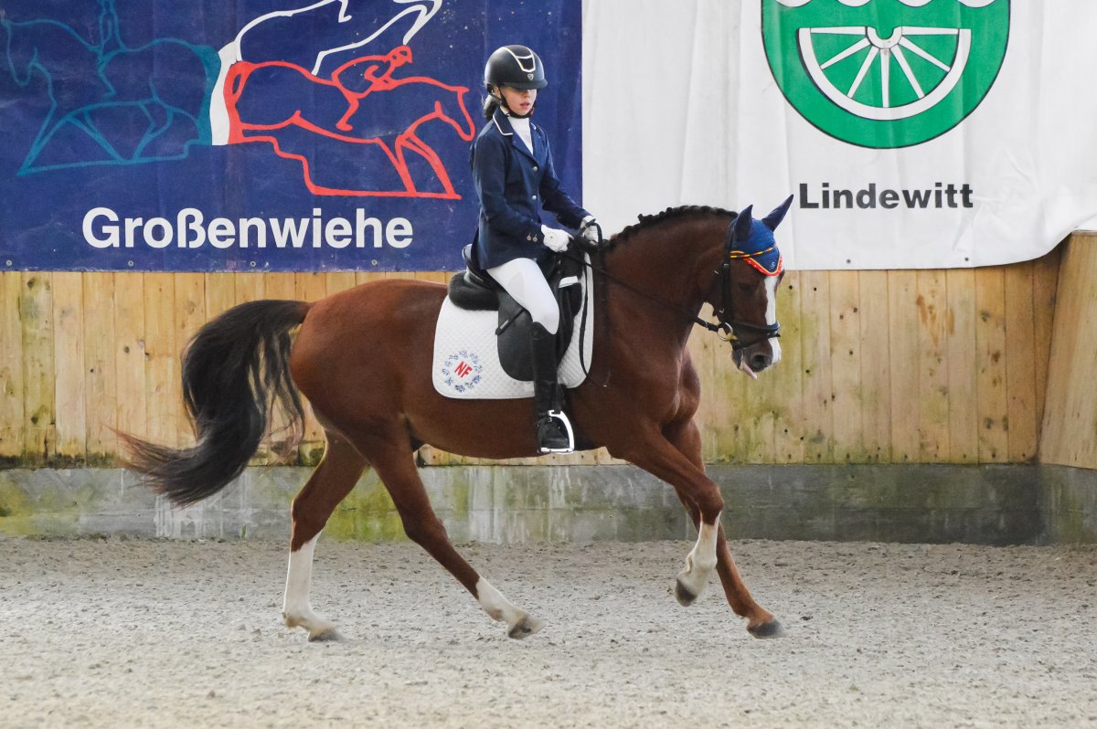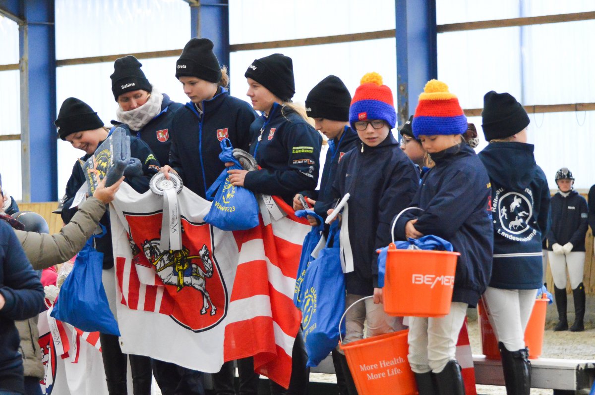 Ein ereignisreiches Wochenende liegt hinter den Teilnehmern des Landesvierkampfes 2023, der in diesem Jahr im Kreis Schlewig-Flensburg ausgetragen wurde. Rund 50 Nachwuchsreiter gingen für ihre Reiterbünde in den Disziplinen Schwimmen, Laufen, Springen – sowohl in der Einzel- als auch in der Mannschaftswertung – an den Start. Am Samstag Nachmittag startete der Wettkampf mit dem Crosslauf. Während die Junioren der "Großen Tour“ einen 3000 Meter Lauf absolvieren mussten, begrenzte sich die Strecke für die Reiter in der Nachwuchstour auf 2000 Meter. Direkt im Anschluss ging es weiter in die Schwimmhalle, wo die jungen Sportler erneut ihr Können im Schwimmbecken unter Beweis stellen mussten. Abgerundet wurde der Samstagabend mit einem geselligen Beisammensein in der Jugendherberge, wonach Kräfte für den nächsten Tag gesammelt wurden. Am Sonntag standen als erstes die Dressurprüfungen mit Pferdewechsel auf dem Programm. Bereits herbstlich geschmückt war die Vereinshalle in Großenwiehe, die mit besten Bedingungen für die Teilnehmer als Veranstaltungsort für den diesjährigen Vierkampf vorgesehen war. Für die Junioren galt es, zunächst mit dem eigenen Pferd eine Dressurprüfung der Klasse A* zu absolvieren, um dann im Anschluss noch ein fremdes Pferd vorzustellen. Auch die Nachwuchsreiter gingen in der Dressur der Klasse E an den Start, allerdings in einer Mannschaftsdressur ohne Pferdewechsel. Nach den Dressuren ging es im Parcours weiter. Für die Junioren wurde ein Stilspringen der Klasse A mit zwei Sternen aufgebaut, welches für das ein oder andere Paar einige Klippen bereithielt – schließlich war es für viele Pferde das erste Hallenturnier. Somit war der Jubel des Publikums auf den vollbesetzten Rängen groß, sobald die Teilnehmer des eigenen Reiterbundes fehlerfrei blieben. Auch die Nachwuchsreiter in der "Kleinen Tour“ durften sich im Parcours messen – hier in einem E-Springen mit Ausgleich. Im Anschluss fanden sich alle Teilnehmer zur Siegerehrung ein. Für den Reiterbund Nordmark war es ein besonders erfolgreiches Wochenende – Nicht nur durften sie den Wettkampf ausrichten, auch siegte die Mannschaft Nordmark II, vorgestellt von Britta Mühlenbeck, mit 15553 Punkten in der diesjährigen Landesmeisterschaft der Vierkämpfer. Mit 14739 Punkten folgte der Reiterbund Dithmarschen unter der Leitung von Stella Farchim, auf Rang drei mit 14113 platzierte sich die Mix-Mannschaft bestehend aus den Reiterbünden Nordfriesland, Rendsburg-Eckernförde und Pinneberg. Clara Marie Otzen, welche ebenfalls für den Reiterbund Nordmark an den Start ging, sammelte am Sonntag nochmal reichlich Punkte und sicherte sich somit den Titel „Einzel-Landesmeisterin der Vierkämpfer“. Mia Peters aus Dithmarschen freute sich über den Vizetitel, für Ina Losigkeit aus dem gastgebenden Reiterbund gab es in der Einzelwertung die Bronzemedaille. Auch der Reiterbund Nordfriesland hatte allen Grund zum Feiern. Nach erfolgreich absolvierten Disziplinen, sicherten sich die Nachwuchsreiter den Mannschaftssieg. Platz zwei ging an den Reiterbund Dithmarschen, auf Rang drei platzierte sich die Mix-Mannschaft Dithmarschen-Nordfriesland. In der Nachwuchstour brillierte Alva Maj Nissen aus Nordfriesland, die kurzerhand die Einzelwertung für sich entschied. Dicht auf den Fersen war ihr Matha Sophie Breiter aus Rendsburg-Eckernförde, die am Ende auf Platz zwei rangierte. Paula Kampen vom Reiterbund Pinneberg ergatterte sich die Bronzemedaille. „Wir hatten ein fantastisches Wochenende mit toller Stimmung und sind sehr dankbar, dass wir den Vierkampf ausrichten durften. Bereits die Planung im Vorfeld hat durch das gut strukturierte Organisationsteam gut geklappt, sodass für eine rundum gelungene Veranstaltung auf die Beine stellen konnten. Besonders bedanken möchte ich mich an dieser Stelle auch nochmal bei unseren Sponsoren, die diese Veranstaltung so tatkräftig unterstützt haben, und an den Reit- und Fahrverein Großenwiehe für das Bereitstellen der Anlage.“, rundet Britta Mühlenbeck, Jugendwartin des Reiterbundes Nordmark, die Veranstaltung ab.